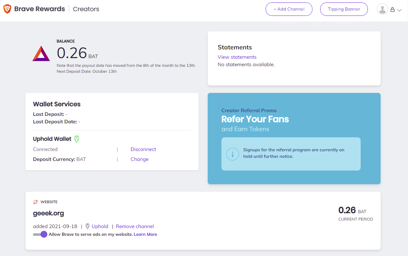 Si vous êtes créateur de contenu sur le Web, pour pouvoir bénéficier de la cryptomonnaie transmise par vos visiteurs, vous devrez déclarer votre site Internet, votre chaine Youtube ou votre compte Twitter sur le site basicattentiontoken. Une fois l'inscription réalisée, vous devrer associer à votre compte à un Wallet de cryptomonnaie hébergée chez Uphold car l'autre partenaire Gemini proposé par la plateforme n'accepte pas pour le moment les utilisateurs sur le territoire français.